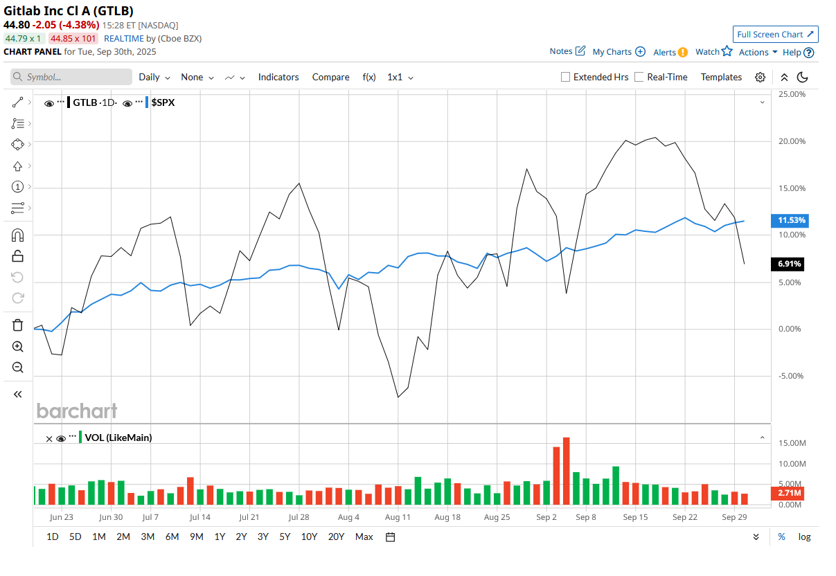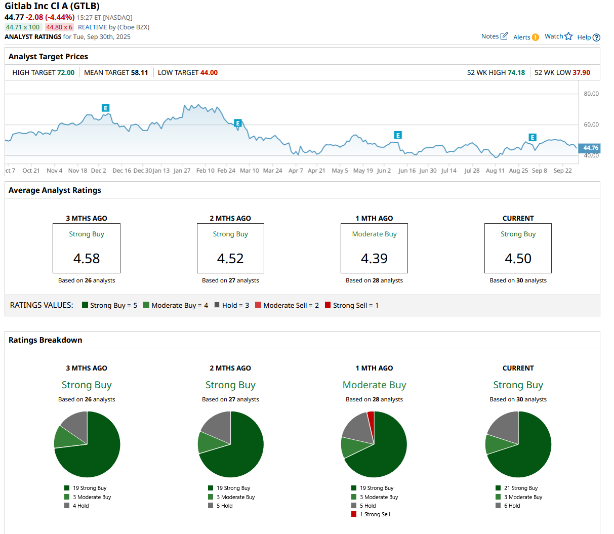 GitLab is implementing a dual-track strategy that combines both sales and product-led initiatives in order to reach more customers and ensure these customers maximize value. In addition, the company has released 72 new features across its paid tiers in recent months, including DevOps, security, and compliance. Management emphasized that GitLab's updated perspective on small business performance, combined with new leadership in its go-to-market strategy, improved the company's ability to balance growth and profitability. AI Momentum and Customer AdoptionArtificial intelligence (AI) was a recurring theme throughout the second quarter. GitLab is positioning its Duo Agent Platform as a differentiator against competitors. Management stated that customers, such as Emirates, selected Duo Enterprise over alternatives like GitHub Copilot, citing GitLab’s integrated AI capabilities. CEO William Staples underlined that GitLab's growth is still primarily driven by seat expansion (more than 70% of revenue growth), with AI and platform adoption opening up additional monetization opportunities. The company is currently transitioning from seat-based licensing to a hybrid of seats and usage-based monetization, charging for work completed by GitLab's or partners' AI agents. The Duo Agent Platform will have a customizable price structure when it launches. Customers will receive some usage included in their standard subscriptions, and they can pay as they go or commit in advance for better pricing. The company has also announced agentic collaborations with Google (GOOG) (GOOGL), Amazon (AMZN), Anthropic, OpenAI, and Cursor. In the quarter, the company also announced a CFO transition with Brian Robins stepping down to pursue another opportunity. Meanwhile, James Chen, Vice President of Finance, will serve as interim CFO. Management highlighted that ex-CFO Robins played a central role in scaling GitLab by improving margins and free cash flow. Investors will have to watch how the leadership transition works in the company’s favor. The company is confident in its ability to scale sustainably while providing shareholder value. The company generated $46 million in free cash flow during the quarter. While keeping its sales prediction, GitLab increased its profit forecast for fiscal 2026, noting solid operating leverage and controlled growth amid ongoing softness in the small-business segment. For the full fiscal year 2026, GitLab expects a 24% increase in revenue to range between $936 million and $942 million, while adjusted earnings could land between $0.82 and $0.83, a significant increase over $0.74 in fiscal 2024. Analysts who cover GTLB stock expect revenue to be in line with management’s forecasts but earnings to be slightly higher at $0.84 per share for fiscal 2026. Revenue and earnings are further expected to increase by 20.7% and 17.3% in fiscal 2027. GitLab stock is trading at a premium of 47x forward estimated earnings, reflecting the company’s long-term growth potential. By expanding AI partnerships, introducing usage-based pricing, and strengthening its leadership bench, the company aims to sustain both growth and profitability while capturing long-term value in an increasingly competitive AI software market. What Is the Target Price for GTLB Stock?The average target price of $58.11 implies GTLB stock can climb by 30% from current levels. Plus, its high price estimate of $72 suggests the stock has an upside potential of 60% over the next 12 months. Of the 30 analysts covering the stock, 21 rate it a “Strong Buy,” three say it is a “Moderate Buy,” and six rate it a “Hold.” ![]() On the date of publication, Sushree Mohanty did not have (either directly or indirectly) positions in any of the securities mentioned in this article. All information and data in this article is solely for informational purposes. For more information please view the Barchart Disclosure Policy here. |
