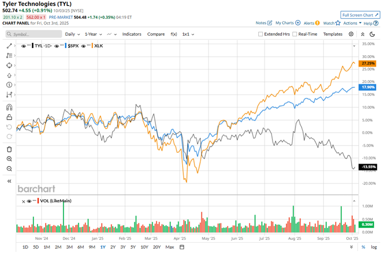 What You Need to Know Ahead of Tyler Technologies’ Earnings Release![]() Texas-based Tyler Technologies, Inc. (TYL) is a leading provider of integrated software and technology solutions for the public sector. Its end-to-end platforms help local, state, and federal governments operate efficiently, transparently, and collaboratively with residents and across departments. By connecting data and processes across previously siloed systems, Tyler empowers clients to turn actionable insights into real-world solutions for their communities. With over 45,000 successful installations across 13,000 sites, including clients in all 50 U.S. states, Canada, the Caribbean, Australia, and beyond, Tyler’s footprint continues to grow globally. The company’s market capitalization currently stands at around $21.7 billion. Having reported its fiscal 2025 second-quarter results in July, the company is now preparing to roll out its third-quarter earnings soon. And ahead of this event, analysts are looking for Tyler Technologies to post earnings of $2.22 per share in the upcoming report, a 13.9% increase from the $1.95 per share it earned in the same quarter last year. The company has a proven track record of exceeding expectations, having topped Wall Street’s profit estimates in each of the past four quarters. For fiscal 2025, earnings are projected to rise 14.6% to $8.69 per share, up from $7.58 reported in fiscal 2024, followed by another 14.2% gain in fiscal 2026, lifting EPS to $9.92. ![]() Tyler Technologies shares have lagged over the past year, dropping roughly 13.6% and underperforming both the broader market and tech peers. For comparison, the broader S&P 500 Index ($SPX) has climbed roughly 17.8% over the same period, while the Technology Select Sector SPDR Fund (XLK) surged an impressive 27.8%. ![]() Tyler Technologies shares surged 5.4% after the company reported second quarter on July 30, comfortably beating Wall Street’s top and bottom-line estimates. Total revenue climbed 10.2% year-over-year (YOY), while adjusted EPS jumped a notable 21.2%. SaaS revenue soared 21.5%, marking 18 consecutive quarters SaaS growth of 20% or more. Transaction-based services also posted a 21.3% gain, fueled by higher volumes and new offerings. Strong gross and operating margin expansion reflected a favorable revenue mix, improved cloud efficiency, and disciplined expense management, underscoring Tyler’s ability to deliver both growth and profitability. Moreover, despite Tyler Technologies’ muted stock performance over the past year, Wall Street sentiment remains cautiously optimistic on the company. The stock holds an overall “Moderate Buy” rating, with 12 of 19 analysts recommending a “Strong Buy,” one suggesting a “Moderate Buy,” and six issuing a “Hold.” The mean price target for TYL is $679, which indicates about 35.2% potential upside from current levels. On the date of publication, Anushka Mukherjee did not have (either directly or indirectly) positions in any of the securities mentioned in this article. All information and data in this article is solely for informational purposes. For more information please view the Barchart Disclosure Policy here. |