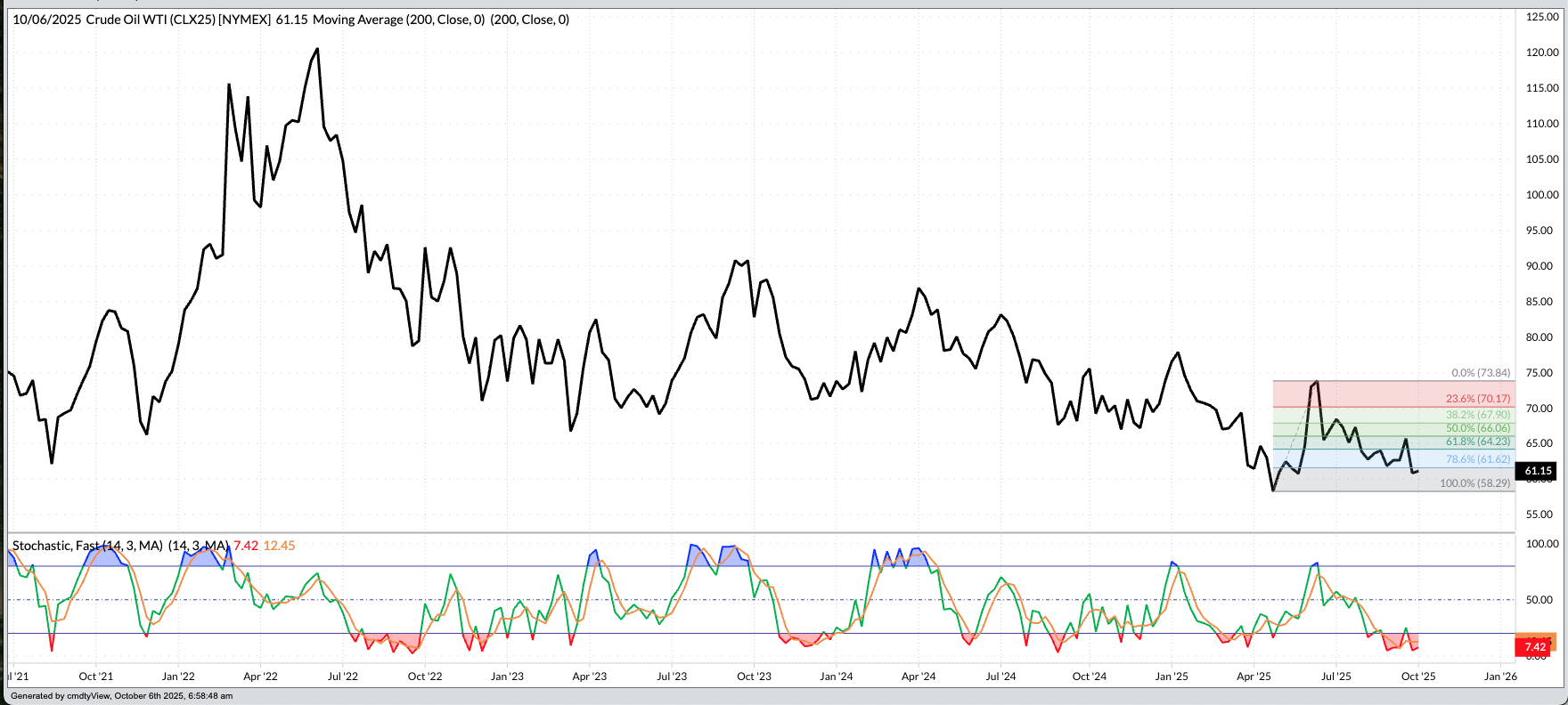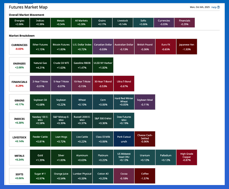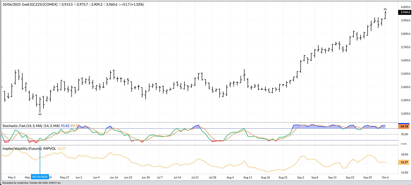 ![]() An initial running of the traps of the various sectors of the commodity complex early Monday morning makes one thing clear: It is going to be another fun week. As usual, I started with currencies and saw the US dollar index ($DXY) had strengthened as much as 0.77 and was sitting near its session high at this writing. Did the US government shutdown end while we were sleeping? A quick search of the subject showed conflicting headlines on progress between the two political parties. What a shock. In other news, the Financials sector, consisting of US Treasury futures, was in the red while yields continued to climb reflecting the ongoing uncertainty along with growing concern over inflation resulting in higher interest rates. With that as a background, let’s check in on what the Three Kings of the commodity complex, along with their respective kingdoms, are saying about the week ahead. ![]() Let’s start with King Gold and the Metals sector. December gold (GCZ25) extended its record rally to an overnight high of $3,973.70, up another $64.80 (1.7%) despite the strength of the US dollar. King Gold confirms what we already knew: Global economics and politics remain clouded by uncertainty with the only certainty seemingly increased inflation. (Say that 10 times fast.) So much so, as mentioned above, the possibility of higher interest rates is growing stronger. Moving along with gold is its sidekick silver where the December contract added as much as $0.625 (1.3%) through Monday’s early morning hours. As I’ve said before, the only thing that matters in Metals at this point is trend, price direction over time, as it brings to mind Newton’s First Law of Motion applied to markets: A trending market will stay in that trend until acted upon by an outside force. The trend in Gold (and Silver) is up as central banks around the world continue to buy. ![]() Over in the Energies sector, King Crude Oil (WTI) (CLX25) gained as much as $1.24 (2.0%) through early Monday morning. Additionally, futures spreads showed stronger backwardation across the board, though that and a crisp $5 bill might get you a cup of coffee from your local barista. (A side note: The December coffee futures contract (KCZ25) was showing the largest pre-dawn loss in the commodity complex, down 1.6% from last Friday’s close.) Why am I skeptical about what King Crude’s forward curve is showing us, from a fundamental point of view? Because the curve has been in backwardation, mostly, for at least the past 5 years. And if a forward curve in backwardation reflects a bullish supply and demand situation, then why has crude oil trended sideways to down for much of that same time? There seems to be a growing disconnect between the forward curve and the futures market. Why? I don’t know. But I can see the “what”, and I don’t think the dynamics of the market (sector) are going to change this coming week. ![]() King Corn was quietly higher early Monday morning. The December issue (ZCZ25) posted a 2.5-cent trading range, 1.25 cents either side of unchanged, on trade volume of 14,300 contracts through the pre-dawn hours and was sitting 0.5 cent higher at this writing. I don’t think we can read much into this, though it is interesting to note a large rain system moving across the US Plains and Midwest to start the week, likely putting the brakes on what has been a fast-paced fall harvest to this point. A quick check of market fundamentals and we see the National Corn Index came in last Friday night at $3.78, down 2.25 cents for the week and putting national average basis at 41.0 cents under December futures as compared to the previous Friday’s final figure of 41.75 cents under December. Speaking of Dec25, it closed Friday at $4.19, down 3.0 cents for the week. The Dec-March futures spread closed at a carry of 16.75 cents and covered 54% calculated full commercial carry, both unchanged from the previous week’s settlement. This tells us Watson likely increased its net-short futures position last week, leaving the door open to possible short-covering activity. For now, market volatility remains low, so I’m expecting corn to stay quiet this week. On the date of publication, Darin Newsom did not have (either directly or indirectly) positions in any of the securities mentioned in this article. All information and data in this article is solely for informational purposes. For more information please view the Barchart Disclosure Policy here. |