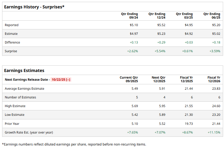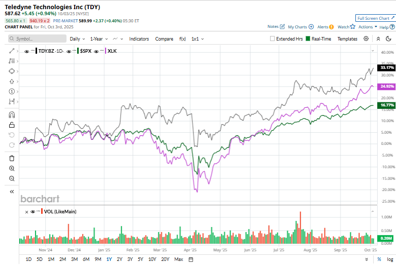 Teledyne Technologies’ Q3 2025 Earnings: What to Expect![]() With a market cap of around $27.6 billion, Teledyne Technologies Incorporated (TDY) is a differentiated technology powerhouse operating at the intersection of defense, industrial monitoring, and high-end digital imaging. Far from a typical industrial conglomerate, Teledyne's portfolio is built around "enabling technologies," highly specialized sensors, electronics, and systems, that are critical to government, aerospace, and deepwater exploration customers. The Thousand Oaks, California-based company is expected to announce its fiscal Q3 2025 earnings results soon. Ahead of this event, analysts expect TDY to report an adjusted EPS of $5.49 per share, a 7.7% growth from $5.10 in the year-ago quarter. It has consistently exceeded Wall Street's earnings expectations in the past four quarters. For fiscal 2025, analysts expect the company to report adjusted EPS of $21.44, representing an 8.7% increase from $19.73 in fiscal 2024. Moreover, adjusted EPS is anticipated to grow 11.2% year-over-year to $23.83 in fiscal 2026. ![]() Shares of Teledyne Technologies have gained 33.7% over the past 52 weeks, outpacing the broader S&P 500 Index's ($SPX) 17.8% return and the Technology Select Sector SPDR Fund's (XLK) 27.8% rise over the same period. ![]() On Jul. 23, TDY reported Q2 results, with revenue rising 10.2% year-over-year to a record $1.5 billion, surpassing consensus estimates by 2.7%. Moreover, its adjusted EPS of $5.20 grew 13.5% from the same period last year and came in 3.6% ahead of analyst expectations. Although the market initially pushed the stock to a new 52-week high of $570.56, it closed down by 1.7%. Analysts' consensus view on Teledyne Technologies stock remains very bullish, with a "Strong Buy" rating overall. Out of 11 analysts covering the stock, eight recommend a "Strong Buy," one "Moderate Buy," and two "Hold." TDY’s average analyst price target of $607.40 indicates a premium of 3.4% from the current market prices. On the date of publication, Kritika Sarmah did not have (either directly or indirectly) positions in any of the securities mentioned in this article. All information and data in this article is solely for informational purposes. For more information please view the Barchart Disclosure Policy here. |