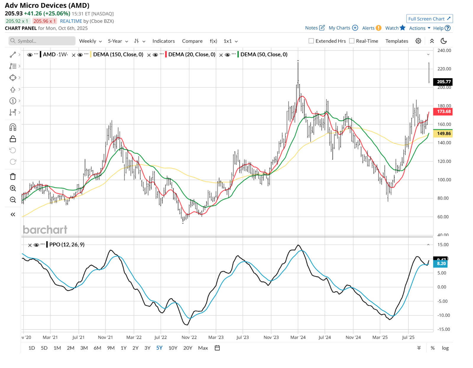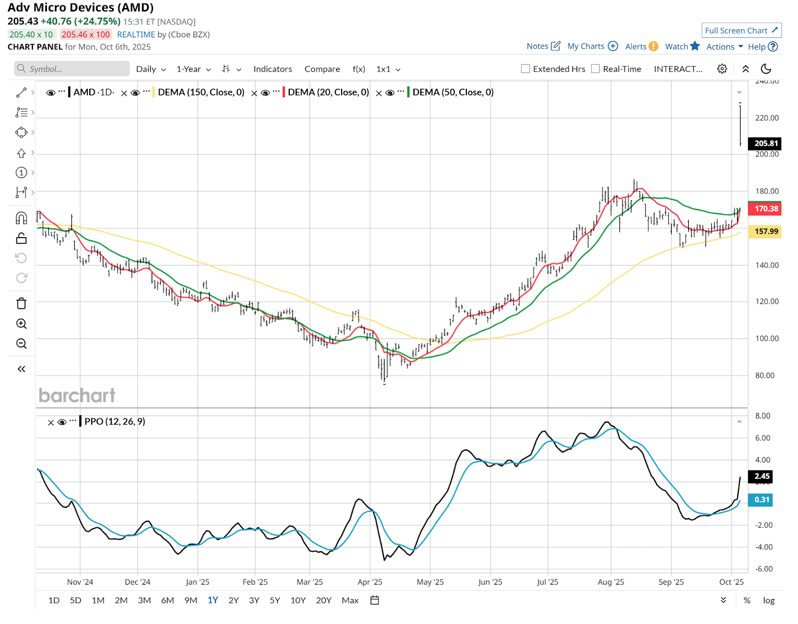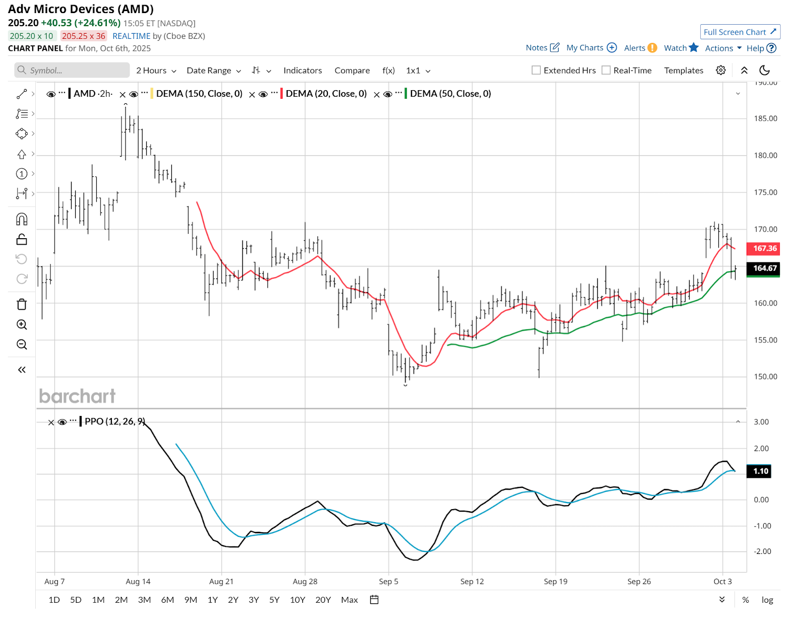 I Told You How to Trade AMD Stock to $200. Now That It’s an ‘AI Hero,’ Here’s 1 Way to Play Its Next Move.![]() Exactly two months ago, I wrote an article here on Advanced Micro Devices (AMD), which began as follows: “Imagine saying this to yourself in your best sinister voice: ‘That’s a nice profit you have on that stock there. It would be a shame if something happened to it.’” Then, as always, I wasn’t attempting to predict the future. I was trying to hedge the risk of taking risks. I’ve invested through every market calamity since the 1987 crash, and that’s enough to make “defense” even more important than “offense” in my book. That applies to my swing trades, long-term investments, and everything in between. Since that Aug. 6 article and through last Friday, Oct. 3, AMD has had something for everyone, except those who bought it that day and held it through Friday. As shown in this chart of 2-hour prices, the stock moved 10% in either direction but closed the period roughly flat. And then, we received Monday’s big news. ![]() AMD announced that OpenAI will use its chips as part of its massive, historic investment in AI infrastructure. OpenAI even gets an option to buy up to 10% of AMD stock under certain conditions. For AMD, this is like having the Wizard of Oz select you to be his business partner. Chat AMD?This either has long-term implications or shorter-term disaster potential. Or both. That’s why, as I described in August, AMD sets up here as an ideal collar candidate. If you own it, or if you are thinking of owning it. As I see it, if I’m going to buy a stock that just went flying in a single day and has a penchant for, shall we say, excitement in both directions, I have two choices: