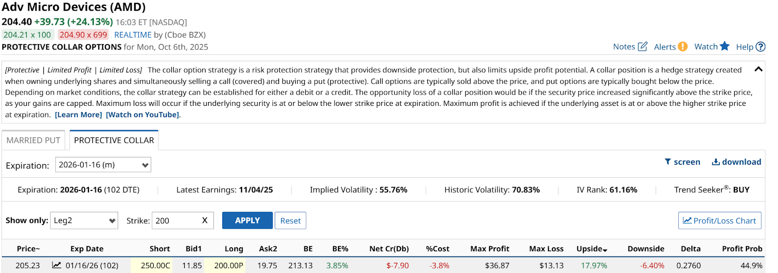 While some balk at selling the covered call option, I remind you that last I checked, if AMD hits my call strike price, there’s no law against my buying more stock. That’s a “high class problem” to me, as we’ll see in this updated collar example below. First, let’s chart AMD. For me, collaring any stock or ETF is not about those intense option analytics, as much as placing the put and call strike prices at strategic levels. That’s what the chart work helps me do. AMD’s Chart Shows Potential, Both WaysAMD’s daily picture obviously shows that vault higher Monday. And while the Percentage Price Oscillator (PPO) indicator at bottom is not through the proverbial roof yet, I don’t take a single day’s move like this lightly. ![]() Especially when the weekly chart shows a potential double-top in the $227 area the stock opened near on Monday morning. AMD last saw that territory back about 19 months ago. Don’t think markets have a memory? Check this out! ![]() The mission here is to see how to have access to further upside, but “name my price” on the downside, in terms of how much I can lose on, say 100 shares of AMD. Which would cost around $20,500 to buy. That’s worth protecting. Why an Option Collar Is Like a SnowflakeCollars are like snowflakes. Many look alike, but they are all unique. Every combination of put strike, call strike, expiration, and volatility level (current and versus the stock’s own history) are all variables that can be analyzed. As such, a collar strategy is truly as personalized as one wishes to make it. In the case of AMD, as of late in the trading day Monday, this one stood out to me. This collar setup goes out to January 2026, so more than 3 months from now. ![]() The strike prices work out to be very clean, round numbers. The puts at $200, and the calls at $250. The cost is reasonable to me, at just 3.8%. And that produces a sharp 18% upside potential, versus just 6.4% downside. Or nearly a 3:1 ratio, which is quite good for this short time to expiration. This allows the collar investor to sit back and see what AMD does next, but with a line in the sand to the downside. And with an upside cap nearly 25% above where AMD closed Monday. It’s like melatonin for the restless investor. And given that this stock has shown the ability to move rapidly in a day, despite its large size, I think that’s worth considering. On the date of publication, Rob Isbitts did not have (either directly or indirectly) positions in any of the securities mentioned in this article. All information and data in this article is solely for informational purposes. For more information please view the Barchart Disclosure Policy here. |