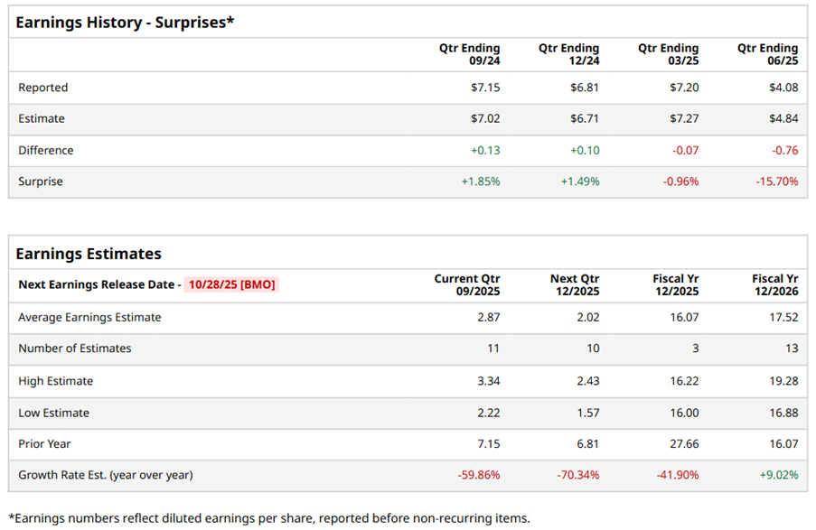 UnitedHealth's Quarterly Earnings Preview: What You Need to Know![]() UnitedHealth Group Incorporated (UNH), headquartered in Minnetonka, Minnesota, owns and manages organized health systems. With a market cap of $324.9 billion, the company provides employers with products and resources to plan and administer employee benefit programs serving customers worldwide. The health insurance giant is expected to announce its fiscal third-quarter earnings for 2025 before the market opens on Tuesday, Oct. 28. Ahead of the event, analysts expect UNH to report a profit of $2.87 per share on a diluted basis, down 59.9% from $7.15 per share in the year-ago quarter. The company beat the consensus estimates in two of the last four quarters while missing the forecast on two other occasions. For the full year, analysts expect UNH to report EPS of $16.07, down 41.9% from $27.66 in fiscal 2024. However, its EPS is expected to rise 9% year-over-year to $17.52 in fiscal 2026. ![]() UNH stock has significantly underperformed the S&P 500 Index’s ($SPX) 17.9% gains over the past 52 weeks, with shares down 37.7% during this period. Similarly, it notably underperformed the Health Care Select Sector SPDR Fund’s (XLV) 4.5% losses over the same time frame. ![]() UNH's underperformance is attributed to ongoing challenges, including DOJ investigations into Medicare billing, the sudden departure of CEO Andrew Witty, and the suspension of earnings guidance amid rising medical costs. The company faces significant headwinds from regulatory issues, funding cuts, and increasing Medicare Advantage costs. On Jul. 29, UNH reported its Q2 results, and its shares closed down by 7.5% in the following trading session. Its adjusted EPS of $4.08 fell short of Wall Street expectations of $4.84. The company’s revenue was $111.62 billion, exceeding Wall Street forecasts of $111.55 billion. Analysts’ consensus opinion on UNH stock is reasonably bullish, with a “Moderate Buy” rating overall. Out of 25 analysts covering the stock, 15 advise a “Strong Buy” rating, two suggest a “Moderate Buy,” six give a “Hold,” and two recommend a “Strong Sell.” While UNH currently trades above its mean price target of $324.48, the Street-high price target of $440 suggests an upside potential of 21%. On the date of publication, Neha Panjwani did not have (either directly or indirectly) positions in any of the securities mentioned in this article. All information and data in this article is solely for informational purposes. For more information please view the Barchart Disclosure Policy here. |