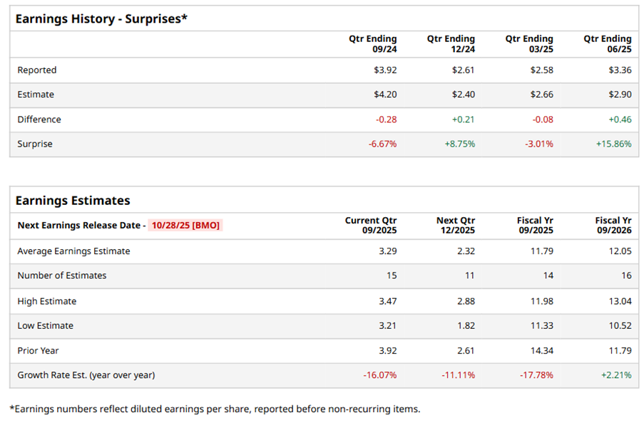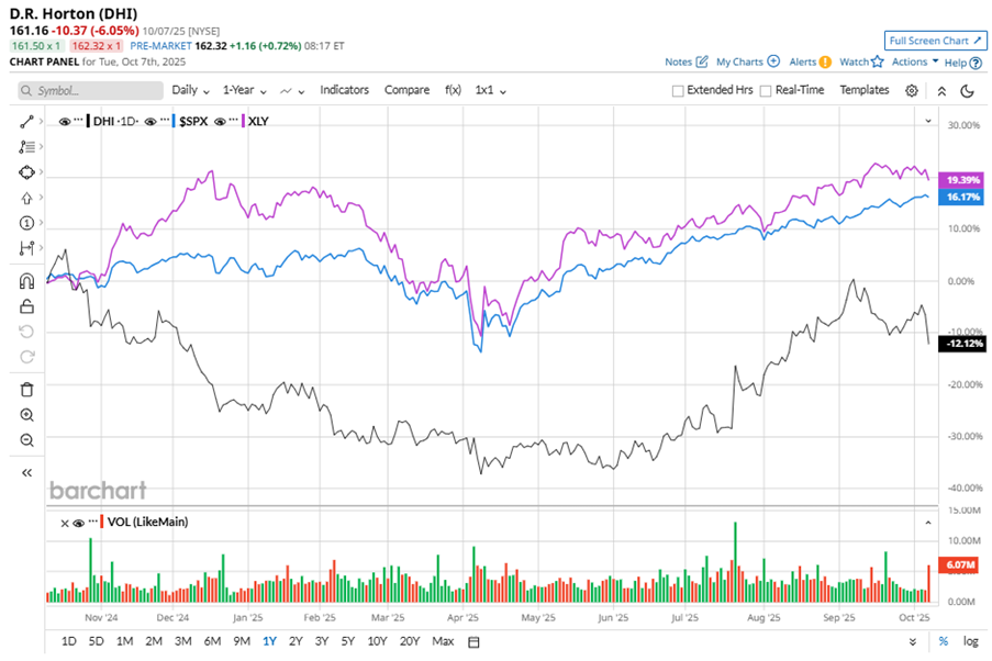 Here's What to Expect From D.R. Horton's Next Earnings Report![]() D.R. Horton, Inc. (DHI) operates as a homebuilding company. Valued at $48 billion by market cap, the company constructs and sells single-family homes designed primarily for the entry-level and move-up markets. DHI also provides mortgage financing and title agency services to homebuyers. The leading homebuilder is expected to announce its fiscal fourth-quarter earnings for 2025 before the market opens on Tuesday, Oct. 28. Ahead of the event, analysts expect DHI to report a profit of $3.29 per share on a diluted basis, down 16.1% from $3.92 per share in the year-ago quarter. The company beat the consensus estimates in two of the last four quarters while missing the forecast on two other occasions. For the full year, analysts expect DHI to report EPS of $11.79, down 17.8% from $14.34 in fiscal 2024. However, its EPS is expected to rise 2.2% year-over-year to $12.05 in fiscal 2026. ![]() DHI stock has considerably underperformed the S&P 500 Index’s ($SPX) 17.9% gains over the past 52 weeks, with shares down 13% during this period. Similarly, it notably underperformed the Consumer Discretionary Select Sector SPDR Fund’s (XLY) 20.8% gains over the same time frame. ![]() On Jul. 22, DHI shares surged 17% after reporting its Q3 results. Its EPS of $3.36 beat Wall Street expectations of $2.90. The company’s revenue was $9.2 billion, topping Wall Street forecasts of $8.8 billion. DHI expects full-year revenue in the range of $33.7 billion to $34.2 billion. Analysts’ consensus opinion on DHI stock is reasonably bullish, with a “Moderate Buy” rating overall. Out of 20 analysts covering the stock, eight advise a “Strong Buy” rating, 10 give a “Hold,” and two recommend a “Strong Sell.” DHI’s average analyst price target is $166.53, indicating a potential upside of 3.3% from the current levels. On the date of publication, Neha Panjwani did not have (either directly or indirectly) positions in any of the securities mentioned in this article. All information and data in this article is solely for informational purposes. For more information please view the Barchart Disclosure Policy here. |