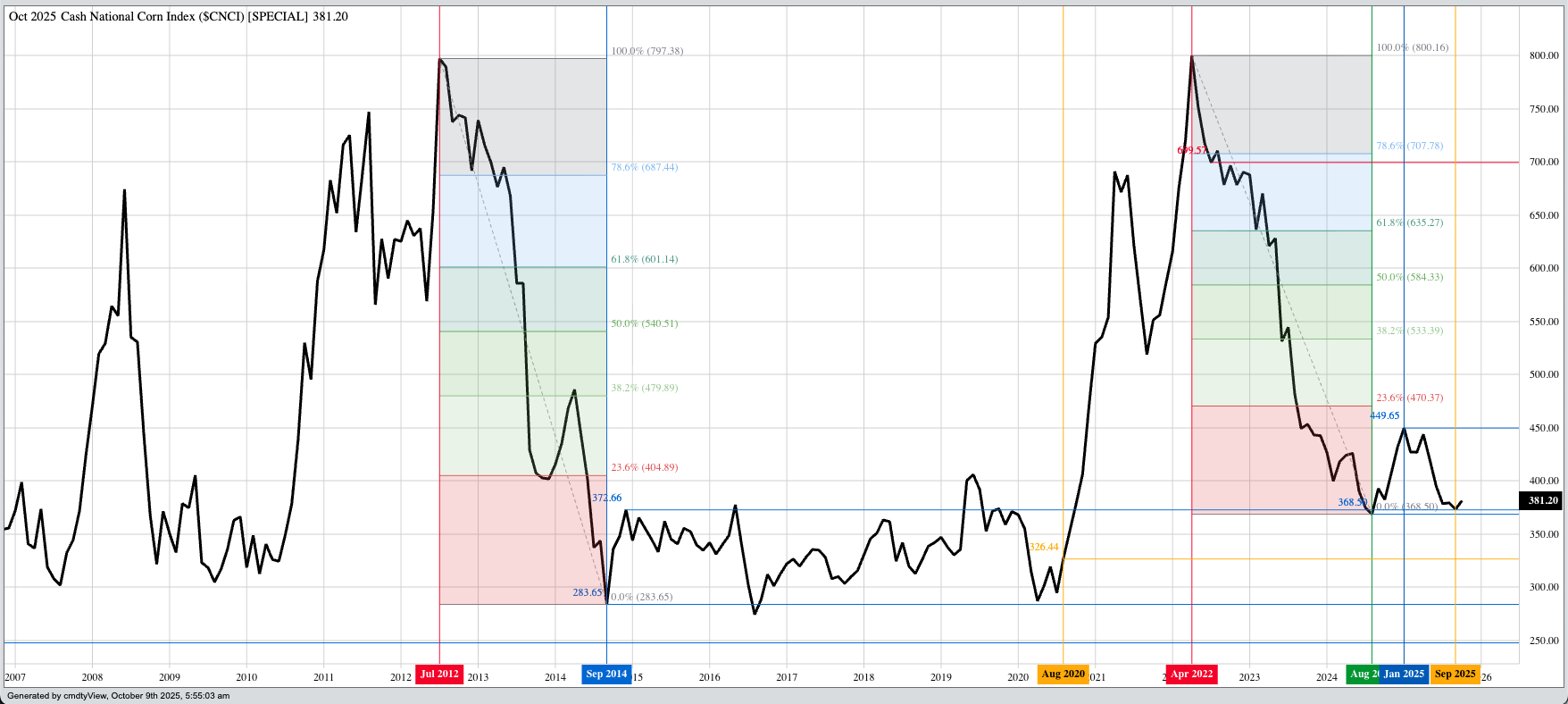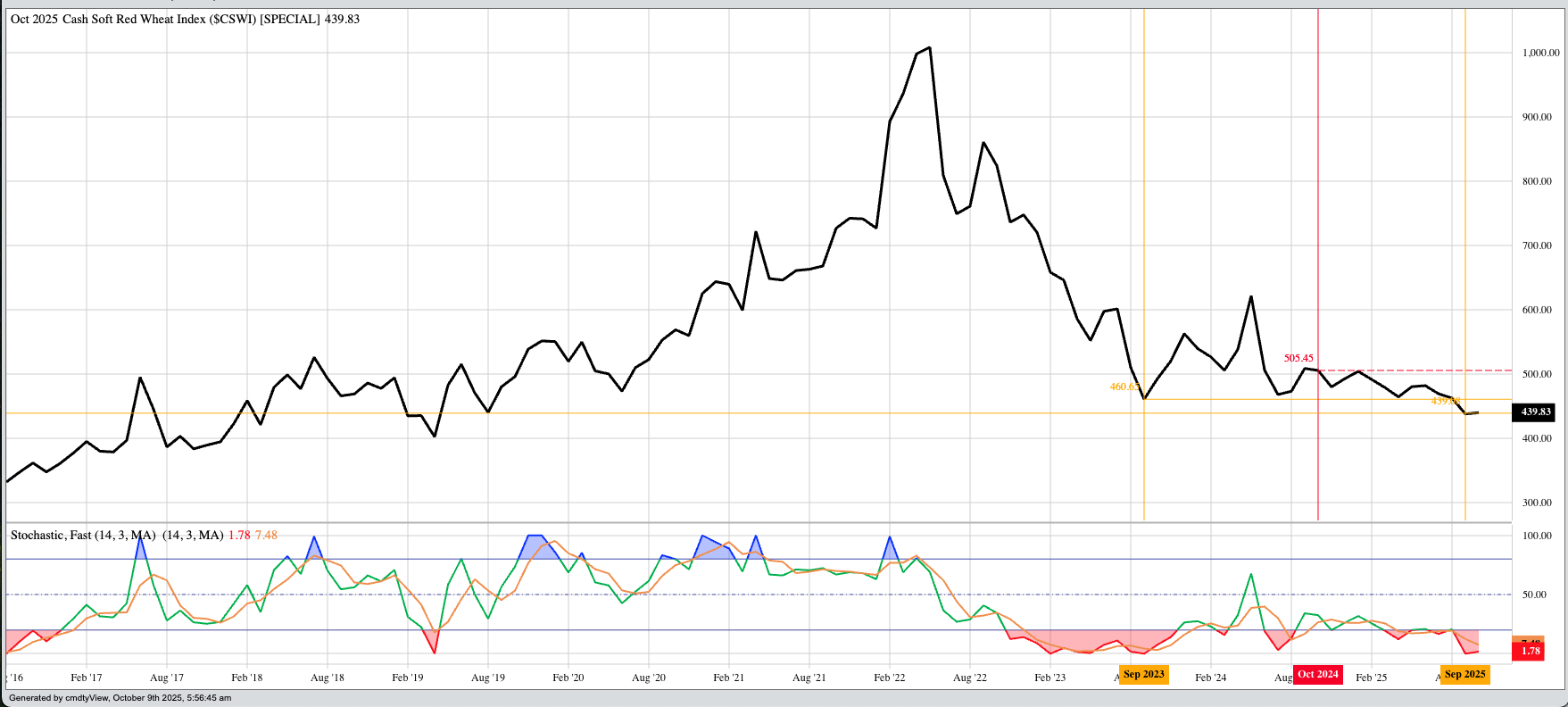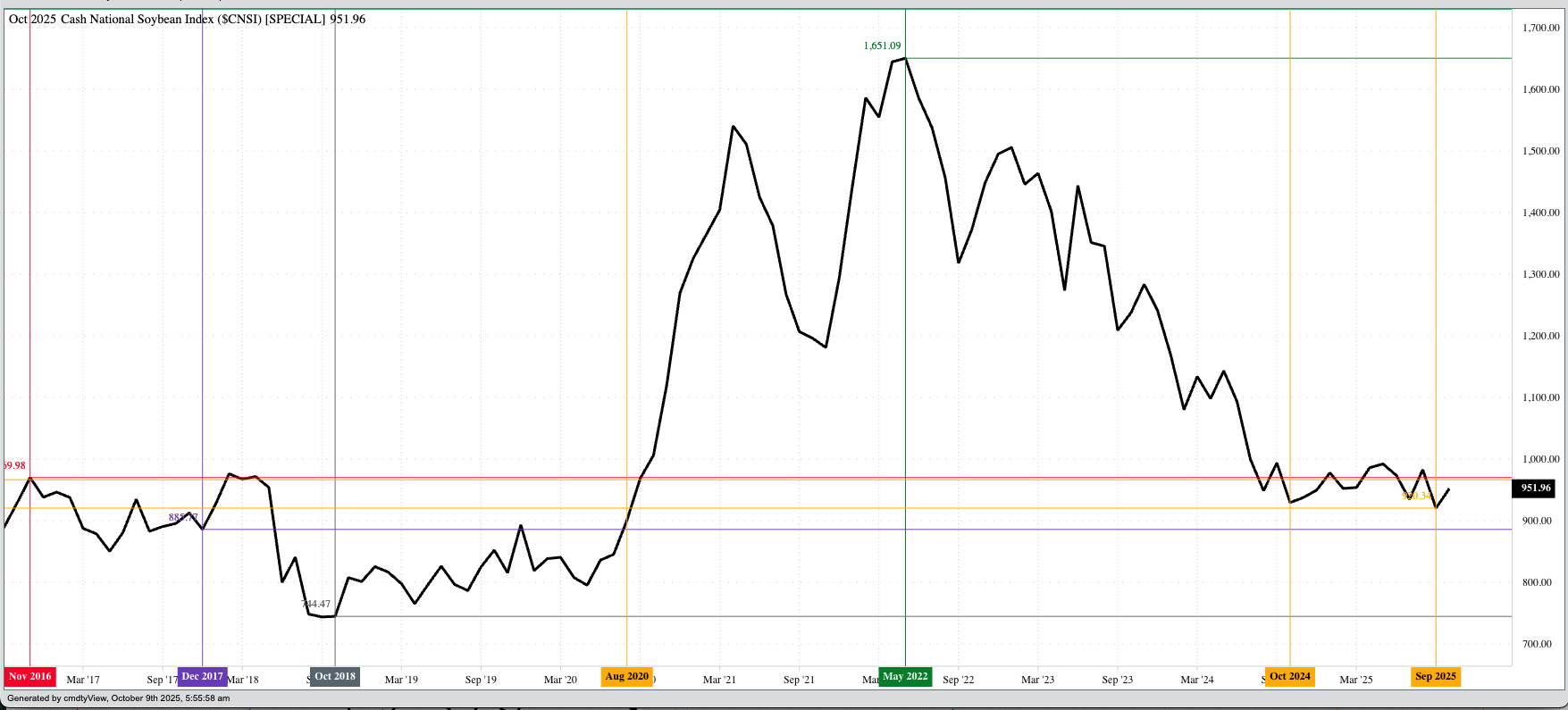 There aren’t many upsides to the US government being shut down, most notably it’s the next big step forward to autocracy. But if looking for a golden needle in a grain pile of wheat, then I can say the fact the US government has been sucked into a black hole for what was supposed to be a USDA WASDE report day means the industry will be forced to actually pay attention to what markets are saying about supply and demand. The reality is this won’t happen. Most of the industry will spend the day like an addict going through withdrawal. Those who have to have numbers to plug into spreadsheets, regardless of if the numbers are completely imaginary, will have tears in their eyes as they stare at empty Excel cells. Some members of ag media will interview each other, asking and answering questions about how they intend to fill empty time and space without the endless stream of made-up government numbers. Meanwhile, those who actually take markets seriously will go on about their business as if today is just another day ending in ‘y’. In other news, both gold and silver took a breather from recent rallies to post modest losses pre-dawn Thursday. ![]() The corn market was quietly lower overnight through early Thursday morning. Yes, that is the same opening line as yesterday, but as the old saying goes, if it ain’t broke, don’t fix it. As of this writing the December issue (ZCZ25) has posted an overnight trading range of 1.75 cents on trade volume of 15,000 contracts and was sitting 0.25 cent lower. Exciting stuff, right? Given this, what do we know about corn’s real fundamentals as we head into this “report day”? The National Corn Index ($CNCI) was priced at $3.8125 Wednesday evening a price that would put the Index in the lower 20% of the price distribution range based on weekly closes only back through 2020. This tells us available supplies in relation to demand are on the large end of the range over the past 5 years. National average basis was calculated Wednesday evening at 40.75 cents under December futures, as compared to 32.25 cents under December this same week last year, which was also the previous 5-year low weekly close for this week. Therefore, we know immediate supply and demand is also more bearish. Longer-term, the Dec-July futures spread covered 41% calculated full commercial carry versus last year’s spread covering 42% this same week indicating an outlook for continued solid demand. ![]() The November soybean contract (ZSX25) was down 4.0 cents pre-dawn after slipping as much as 4.5 cents overnight on trade volume of 22,500 contracts. The fact soybeans took a breather from the rally over the past week isn’t a big surprise, so we’ll see how the rest of the day plays out. Fundamentally, the market remains a long way from bullish. At the end of September, the National Soybean Index ($CNSI) was priced at $9.20, its lowest month-end price since August 2020. Based on the economic Law of Supply and Demand, this told us the US situation was as bearish as it had been in over 5 years. National average basis was calculated at 81.0 cents under November futures as compared to the end of August 2025 figure of 71.75 cents under and the previous 5-year low weekly close for the last week of September at 65.75 cents under November. Also on September 30, the Nov-July futures spread covered 55% calculated full commercial carry as compared to the 52% at the end of August and 46% the same week last year. The bottom line is US fundamentals were more bearish than a year ago, with the outlook for demand to not be great again. ![]() The wheat sub-sector was in the green overnight through early Thursday morning. What stands out to me is all three markets saw an uptick in trade volume with the December SRW issue (ZWZ25) registering nearly 23,000 contracts changing hands overnight. This hints at support coming from more than just noncommercial short-covering, though that activity likely continues to play a role. This week has seen National Indexes firm in relation to futures markets, across the board, indicating commercial support. Some of this is seasonal, as the bulk of newly harvested bushels are generally sold within the first 30 to 60 days of coming to town. This tends to grow supplies in relation to demand, something easily seen at the end of September. The National SRW Index ($CSWI) was priced near $4.38 as compared to its previous 5-year average end of September figure of $6.10 and 10-year average of $5.19. The HRW Index ($CRWI) came in at $4.2150 with its previous averages $6.5350 and $5.2375. The HRS Index ($CRSI) was priced at $5.0950 as compared to $7.1050 and $6.0725. The end of September 2024 saw the three Indexes priced at $5.0875, $5.2475, and $5.7225 telling us fundamentals are more bearish this time around the calendar. On the date of publication, Darin Newsom did not have (either directly or indirectly) positions in any of the securities mentioned in this article. All information and data in this article is solely for informational purposes. For more information please view the Barchart Disclosure Policy here. |