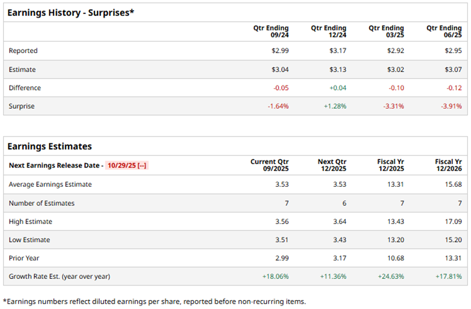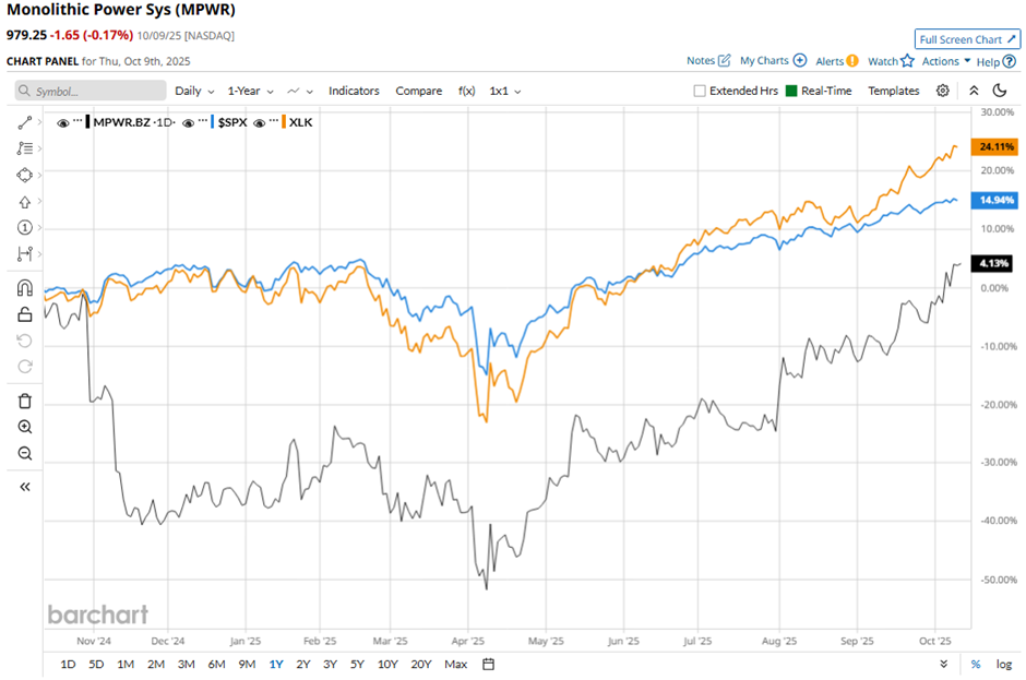 Monolithic Power Systems Earnings Preview: What to Expect![]() With a market cap of $46.9 billion, Monolithic Power Systems, Inc. (MPWR) is a fabless semiconductor company that designs, develops, and markets high-performance analog and mixed-signal power solutions for industrial, automotive, cloud computing, and consumer electronics. The company focuses on innovative power management technologies while partnering with third-party manufacturers for production and assembly. The Kirkland, Washington-based company is slated to announce its fiscal Q3 2025 results soon. Ahead of the release, analysts predict Monolithic Power Systems to report EPS of $3.53, an 18.1% increase from $2.99 in the year-ago quarter. It has exceeded Wall Street's earnings expectations in one of the past four quarters while missing on three other occasions. For fiscal 2025, analysts expect the chipmaker to report EPS of $13.31, marking a surge of 24.6% from $10.68 in fiscal 2024. ![]() Shares of Monolithic Power Systems have risen 4.6% over the past 52 weeks, lagging behind the broader S&P 500 Index's ($SPX) 16.3% gain and the Technology Select Sector SPDR Fund's (XLK) 26.4% increase over the same period. ![]() Shares of Monolithic Power Systems climbed 10.5% following its Q2 2025 results on Jul. 31, as adjusted EPS of $4.21 and revenue of $664.6 million, topping forecasts. The company also guided Q3 revenue to $710 million - $730 million, well above the consensus, reflecting strong demand for its power management solutions in AI and server applications. Analysts' consensus view on MPWR stock remains moderately optimistic, with an overall "Moderate Buy" rating. Out of 16 analysts covering the stock, 10 recommend a "Strong Buy," two "Moderate Buys," and four "Holds." This configuration is slightly more bullish than three months ago, with nine analysts suggesting a "Strong Buy." As of writing, the stock is trading above the average analyst price target of $892.67. On the date of publication, Sohini Mondal did not have (either directly or indirectly) positions in any of the securities mentioned in this article. All information and data in this article is solely for informational purposes. For more information please view the Barchart Disclosure Policy here. |