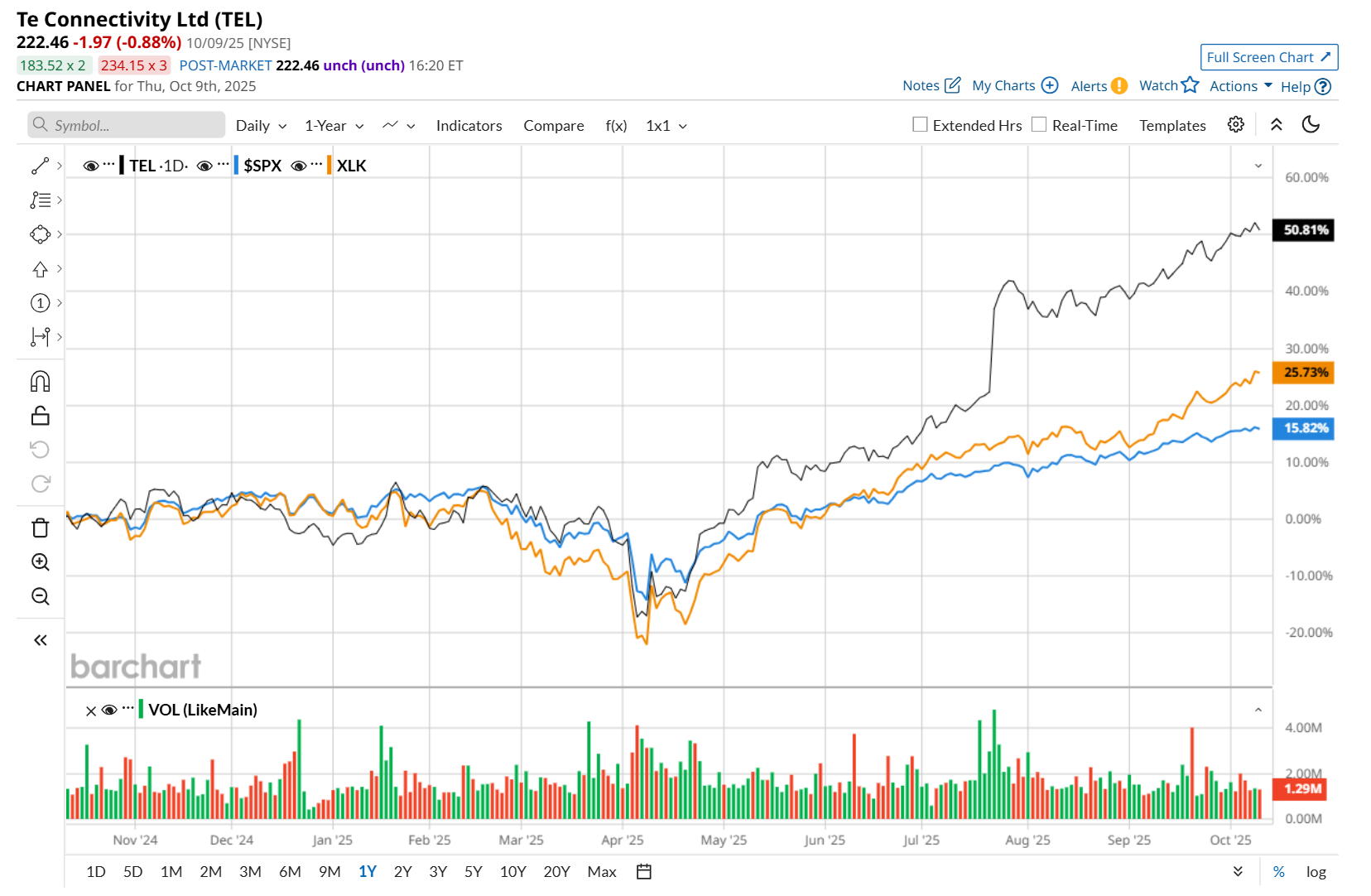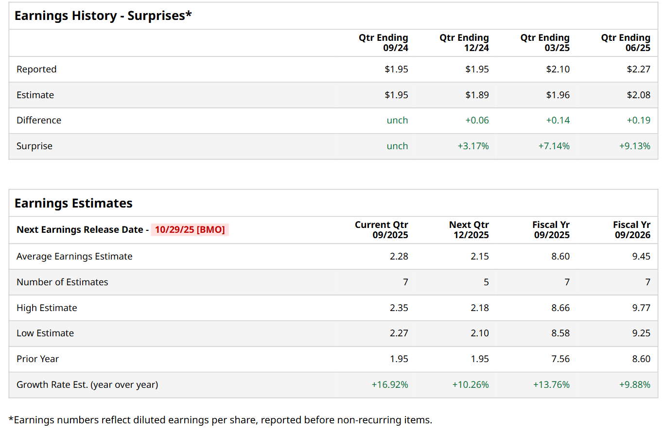 TE Connectivity's Quarterly Earnings Preview: What You Need to Know![]() Valued at a market cap of $65.7 billion, TE Connectivity plc (TEL) is a global industrial technology leader that designs and manufactures advanced connectivity and sensor solutions for critical applications across a wide range of industries, including automotive, industrial automation, aerospace, defense, energy, and healthcare. The Ballybrit, Ireland-based company is scheduled to announce its fiscal Q4 earnings for 2025 before the market opens on Wednesday, Oct. 29. Ahead of this event, analysts expect this tech company to report a profit of $2.28 per share, up 16.9% from $1.95 per share in the year-ago quarter. The company has met or surpassed Wall Street’s bottom-line estimates in each of the last four quarters. In Q3, TEL’s EPS of $2.27 exceeded the forecasted figure by a notable margin of 9.1%. For fiscal 2025, analysts expect TEL to report a profit of $8.60 per share, representing a 13.8% increase from $7.56 per share in fiscal 2024. Furthermore, its EPS is expected to grow 9.9% year-over-year to $9.45 in fiscal 2026. ![]() TEL has rallied 50.9% over the past 52 weeks, considerably outpacing both the S&P 500 Index's ($SPX) 16.3% return and the Technology Select Sector SPDR Fund’s (XLK) 26.3% uptick over the same time frame. ![]() On Jul. 23, shares of TE Connectivity surged 12% after it delivered an impressive Q3 performance. Strong revenue growth across both its business segments, particularly a 30% surge in its industrial solutions division, fueled a 13.9% year-over-year rise in its total revenue to a record $4.5 billion, surpassing consensus estimates by 5.1%. Profitability also reached new highs, with adjusted EPS climbing 18.8% from the prior-year quarter to $2.27, beating Wall Street expectations by 9.1%. Wall Street analysts are moderately optimistic about TEL’s stock, with a "Moderate Buy" rating overall. Among 18 analysts covering the stock, 12 recommend "Strong Buy," and six suggest "Hold.” The mean price target for TEL is $222.47, implying a marginal potential upside from the current levels. On the date of publication, Neharika Jain did not have (either directly or indirectly) positions in any of the securities mentioned in this article. All information and data in this article is solely for informational purposes. For more information please view the Barchart Disclosure Policy here. |