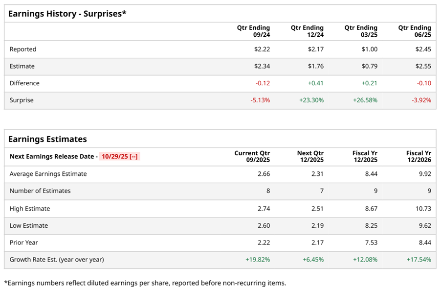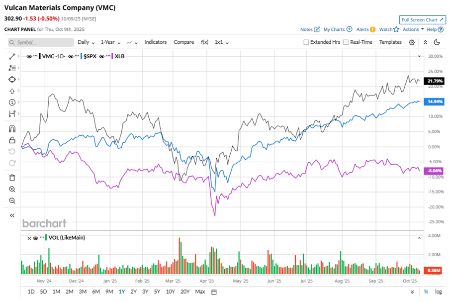 What to Expect From Vulcan Materials’ Q3 2025 Earnings Report![]() Vulcan Materials Company (VMC), headquartered in Birmingham, Alabama, produces and supplies construction aggregates. Valued at $40.2 billion by market cap, the company’s principal product lines are aggregates, asphalt mix and concrete, and cement. The largest producer of construction aggregates is expected to announce its fiscal third-quarter earnings for 2025 before the market opens on Thursday, Oct. 30. Ahead of the event, analysts expect VMC to report a profit of $2.66 per share on a diluted basis, up 19.8% from $2.22 per share in the year-ago quarter. The company beat consensus estimates in two of the last four quarters while missing the forecast on two other occasions. For the full year, analysts expect VMC to report EPS of $8.44, up 12.1% from $7.53 in fiscal 2024. Its EPS is expected to rise 17.5% year-over-year to $9.92 in fiscal 2026. ![]() VMC stock has outperformed the S&P 500 Index’s ($SPX) 16.3% gains over the past 52 weeks, with shares up 25.4% during this period. Similarly, it outperformed the Materials Select Sector SPDR Fund’s (XLB) 6.7% losses over the same time frame. ![]() VMC’s outperformance is driven by increased federal and state funding for highway and public works projects under the IIJA, as well as renewed momentum in private non-residential construction, particularly in data centers, warehouses, and manufacturing. The company's practical cost management framework, supported by the Vulcan Way of Operating, has helped maintain unit costs and drive margin expansion despite weather disruptions. On Jul. 31, VMC shares closed up marginally after reporting its Q2 results. Its adjusted EPS of $2.45 missed Wall Street expectations of $2.55. The company’s revenue was $2.1 billion, falling short of Wall Street's $2.2 billion forecast. Analysts’ consensus opinion on VMC stock is bullish, with a “Strong Buy” rating overall. Out of 21 analysts covering the stock, 15 advise a “Strong Buy” rating, one suggests a “Moderate Buy,” and five give a “Hold.” VMC’s average analyst price target is $310.81, indicating a potential upside of 2.6% from the current levels. On the date of publication, Neha Panjwani did not have (either directly or indirectly) positions in any of the securities mentioned in this article. All information and data in this article is solely for informational purposes. For more information please view the Barchart Disclosure Policy here. |