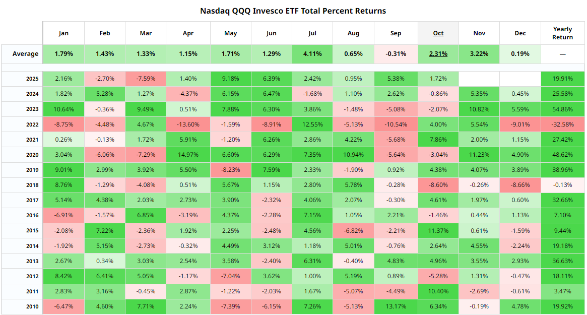 Example 2: Nasdaq’s Seasonal PatternsNext, Gavin looked at the Invesco QQQ Trust (QQQ). The seasonality chart revealed a powerful pattern that most traders overlook. “September historically is the weakest month for QQQ,” Gavin explained. “But from November through March, tech stocks show some of the strongest returns on record.” This “winter tech rally” has appeared consistently over the last 15 years — often aligning with holiday sales, fiscal spending cycles, and earnings optimism. ![]() QQQ Seasonal Takeaways: