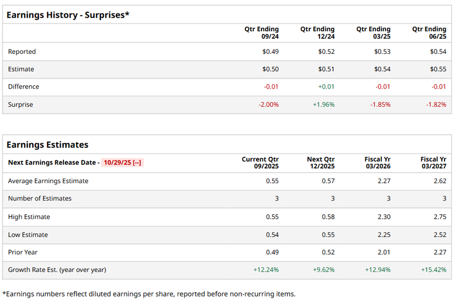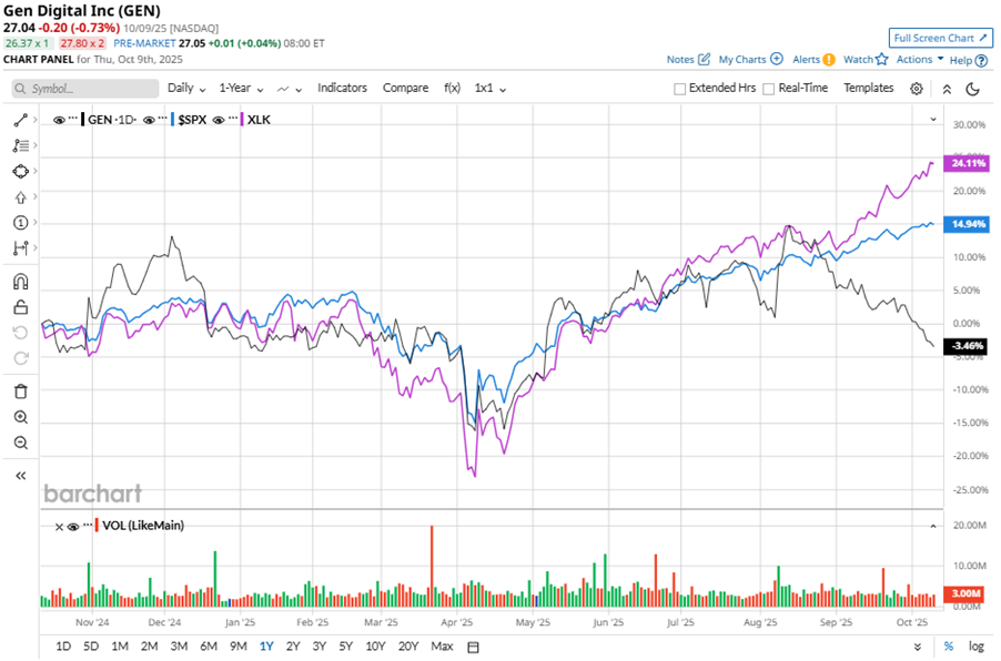 Gen Digital's Q2 2026 Earnings: What to Expect![]() Gen Digital Inc. (GEN), headquartered in Tempe, Arizona, provides cybersecurity solutions for consumers. Valued at $16.7 billion by market cap, the company offers solutions that enable consumers to protect their devices, online privacy, identity, and home networks. The multinational software company is expected to announce its fiscal second-quarter earnings for 2026 after the market closes on Thursday, Nov. 6. Ahead of the event, analysts expect GEN to report a profit of $0.55 per share on a diluted basis, up 12.2% from $0.49 per share in the year-ago quarter. The company missed the consensus estimates in three of the last four quarters while surpassing the forecast on another occasion. For the full year, analysts expect GEN to report EPS of $2.27, up 12.9% from $2.01 in fiscal 2025. Its EPS is expected to rise 15.4% year over year to $2.62 in fiscal 2027. ![]() GEN stock has underperformed the S&P 500 Index’s ($SPX) 16.3% gains over the past 52 weeks, with shares down 2% during this period. Similarly, it underperformed the Technology Select Sector SPDR Fund’s (XLK) 25.9% gains over the same time frame. ![]() GEN's strong Q1 results on Aug. 7 led to a 7.7% surge in its shares in the following trading session. Revenue jumped 30.3% year-over-year to $1.3 billion, with adjusted EPS rising 20.8% to $0.64. Growing demand for protection, trust, and financial services drove the company's growth. GEN also boosted investor confidence by raising its fiscal 2026 guidance, forecasting revenue of $4.8 billion to $4.9 billion, and adjusted EPS of $2.49 to $2.56. Analysts’ consensus opinion on GEN stock is reasonably bullish, with a “Moderate Buy” rating overall. Out of 10 analysts covering the stock, five advise a “Strong Buy” rating, and five give a “Hold.” GEN’s average analyst price target is $35.44, indicating an ambitious potential upside of 31.1% from the current levels. On the date of publication, Neha Panjwani did not have (either directly or indirectly) positions in any of the securities mentioned in this article. All information and data in this article is solely for informational purposes. For more information please view the Barchart Disclosure Policy here. |